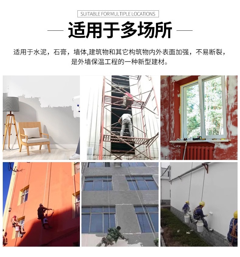 Widely used in the reinforcement and composite of external and internal insulation systems for exterior walls, cement products, asphalt, marble, mosaic, partition boards, gypsum products, and GRC construction materials, it is an ideal engineering material for the building materials industry.